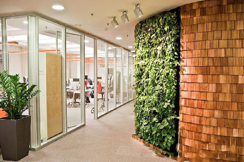 预先在干墙上设置局部凹凸不平的墙面和壁洞,供放置盆栽植物;或在靠墙地面放置花盆,或砌种植槽,然后种上攀附植物,使其沿墙面生长,形成室内局部绿色的空间;