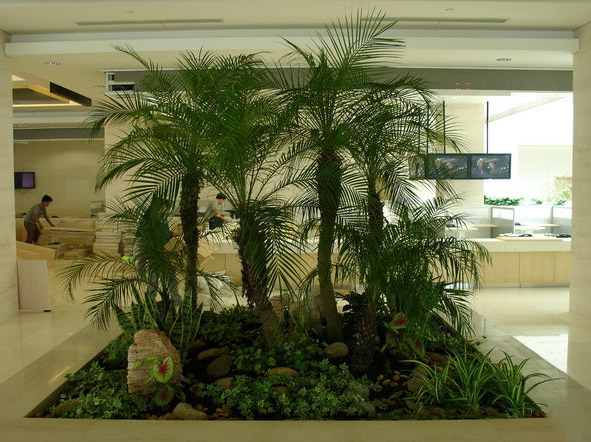 这种装饰方法多用于室内花园及室内大厅有充分空间的场所。栽植时,多采用自然式,即平面聚散相依、疏密有致,并使乔灌木及草本植物和地被植物组成层次,注重姿态、色彩的协调搭配,适当注意采用室内观叶植物的色彩来丰富景观画面;同时考虑与山石、水景组合成景,模拟大自然的景观,给人以回归大自然的美感。