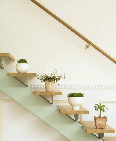 或在墙壁上设立支架,在不占用地的情况下放置花盆,以丰富空间。采用这种装饰方法时,应主要考虑植物姿态和色彩。以悬垂攀附植物材料最为常用,其它类型植物材料也常使用。